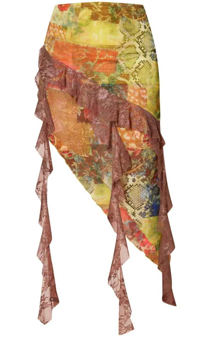 Keep it chic with this multi renaissance printed lined mesh asymmetric lace trim midi skirt. Brought to you in a multi lined mesh material with a renaissance printed design, what more could you want? This midi skirt has an asymmetric lace trim that is sure to add all the edge. Team with your fave heels and accessories for a fool proof finish we are obsessing over.