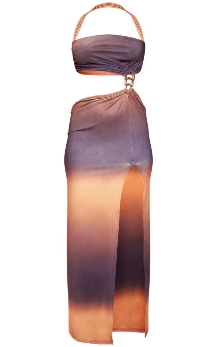 Make heads turn this weekend in this multi slinky ombre cut out split midaxi dress. Brought to you in a multi hue slinky material with an ombre print design, cut out detailing and a side split midaxi length, how can you not fall in love? Style this midaxi dress with heels and gold accessories for a look that won’t be forgotten.