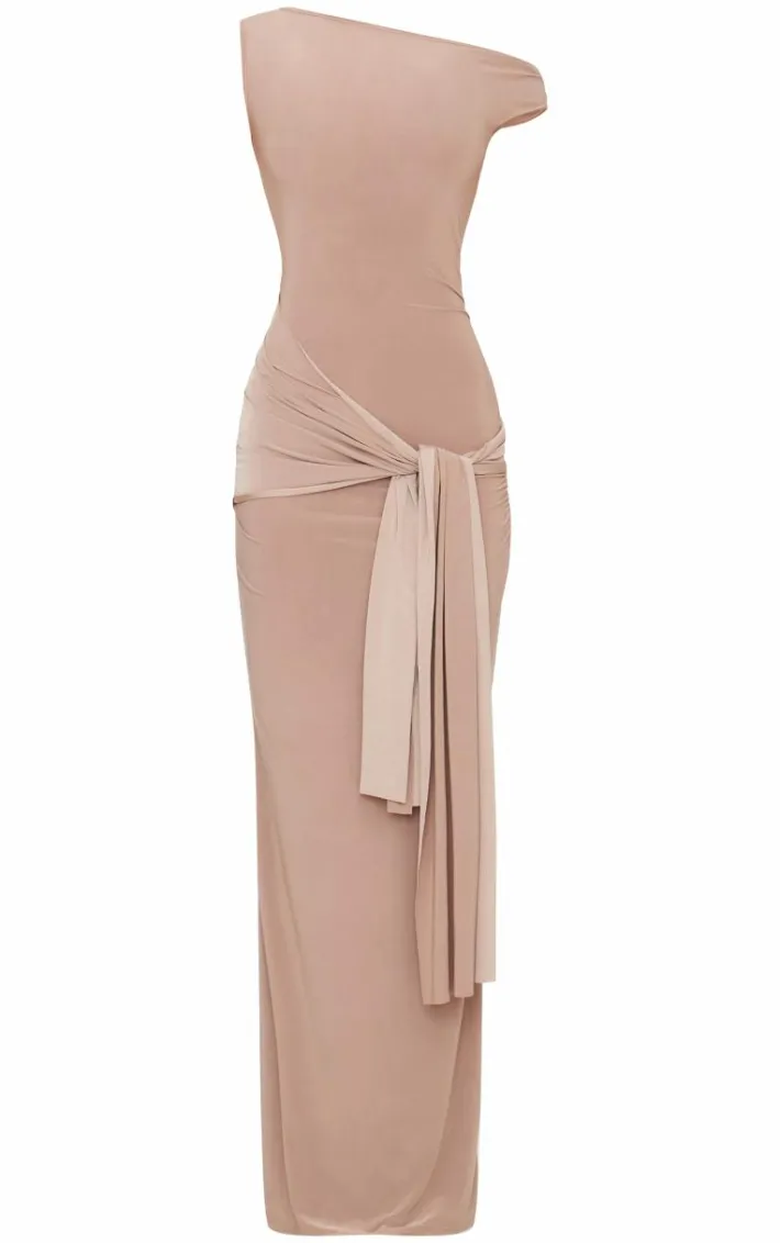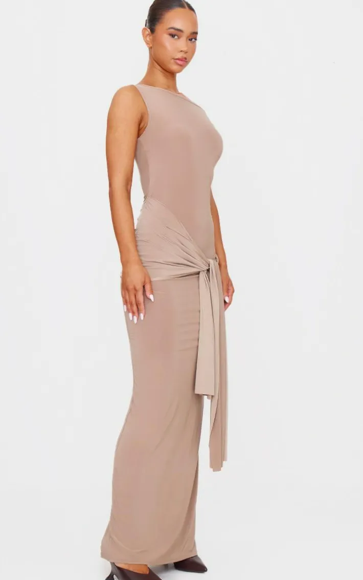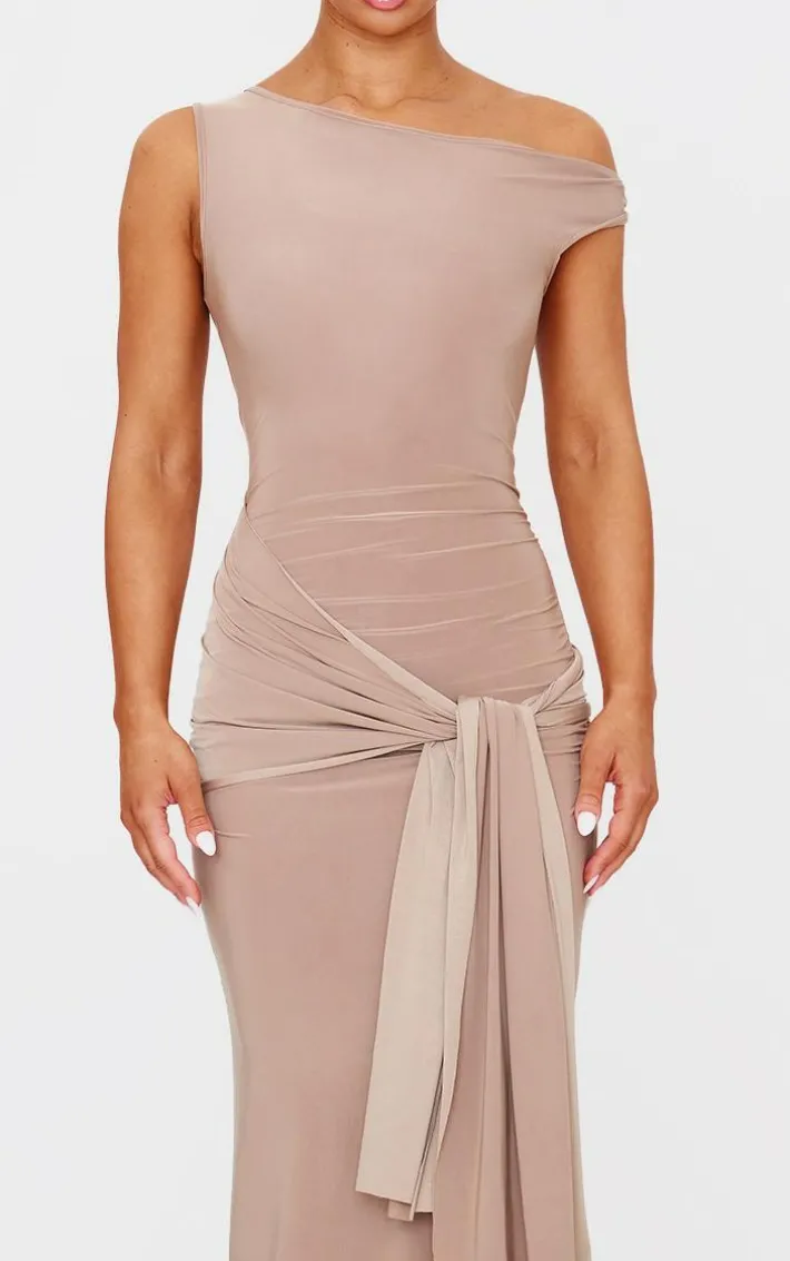 Turn heads in this mushroom slinky off the shoulder wrap detail maxi dress. brought to you in a mushroom slinky material with an off the shoulder design and a wrap detail, we are obsessed. This maxi dress pairs perfectly with a pair of heels and your go-to hoop earrings to feel glam this season and beyond.