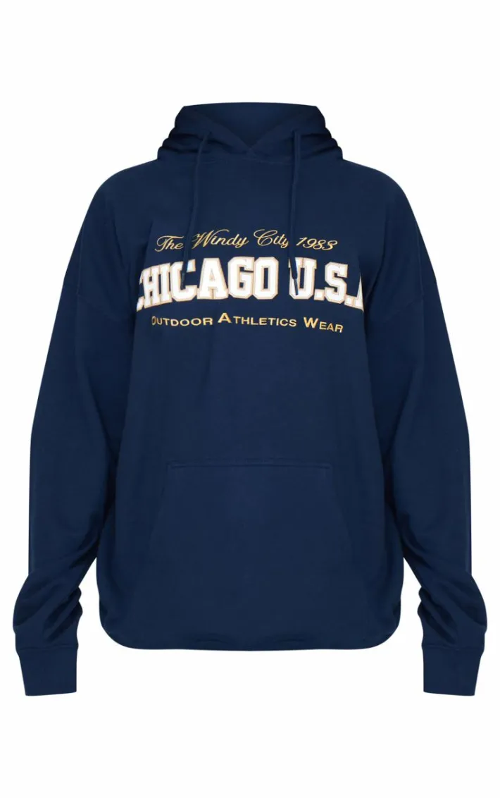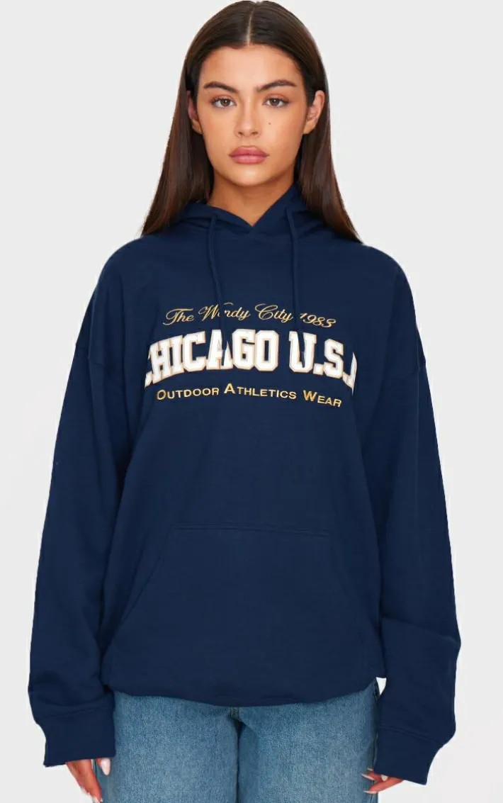 Elevate your off duty look with this navy Chicago USA embroidered hoodie. Made from a navy hue material with a ‘Chicago USA’ embroidered design, this hoodie is all the new you need. How can you resist? Style with blue jeans, fresh kicks and simple accessories for a look like no other.