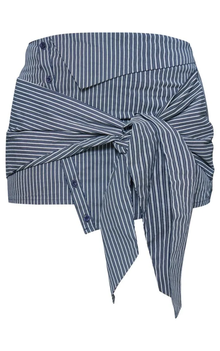 Make sure your weekend look stays on point with this navy pinstripe shirt style asymmetric mini skirt. Brought to you in a navy hue pinstripe material with an asymmetric design and a mini fit, how can you resist? Style this mini skirt with a shirt, court heels and simple gold accessories for an outfit that will have you looking all kinds of chic.