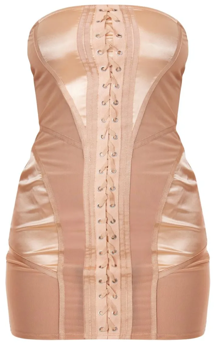 Get ready to make everyone stop and stare this weekend with this nude mesh panel lace up bandeau bodycon dress. Whether you’re meeting up with your besties or have plans with someone special, this bodycon dress is sure to impress. With a nude hue material, mesh panels and lace-up detailing, how could you not be in love? Simply add your highest heels and a mini bag for a flawless finish that is sure to steal all the stares.