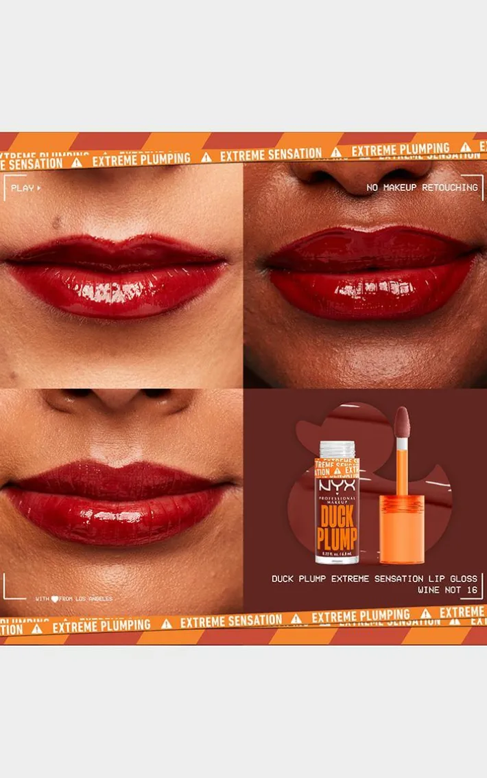 CAUTION! CAUTION! May cause duck lips! Get instant and overtime plumping for the ultimate injectionless pout with duck plump extreme sensation plumping gloss! Feel the extreme plumping sensation powered by spicy ginger. Giving you 2 transparent shades and 16 high pigment shades to play from! Maximum intense color with minimum effort! Vegan formula. Pro performance.