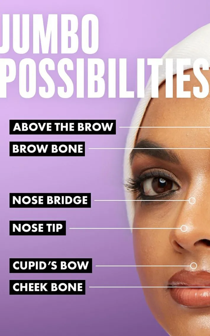 Jumbo Multi-use Face Stick applies seamlessly over or without foundation, swipe on the pigment packed stick to the cheek to highlight the highpoints, to the lips for a lit-up cupids bow, to the nose for an illuminated define point, and the cheeks for an accentuated pop.