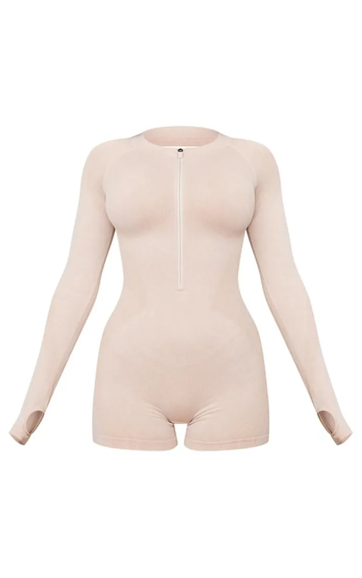 Be on trend this season with this oatmeal acid wash seamless rib cut out back short gym unitard. Brought to you in an oatmeal acid wash ribbed material with a cut-out back and a seamless design, you will bring all the edge to your outfit of the day. This unitard is perfect for those on the go days. Team with box-fresh kicks and accessories to be the center of attention wherever you step foot this season.