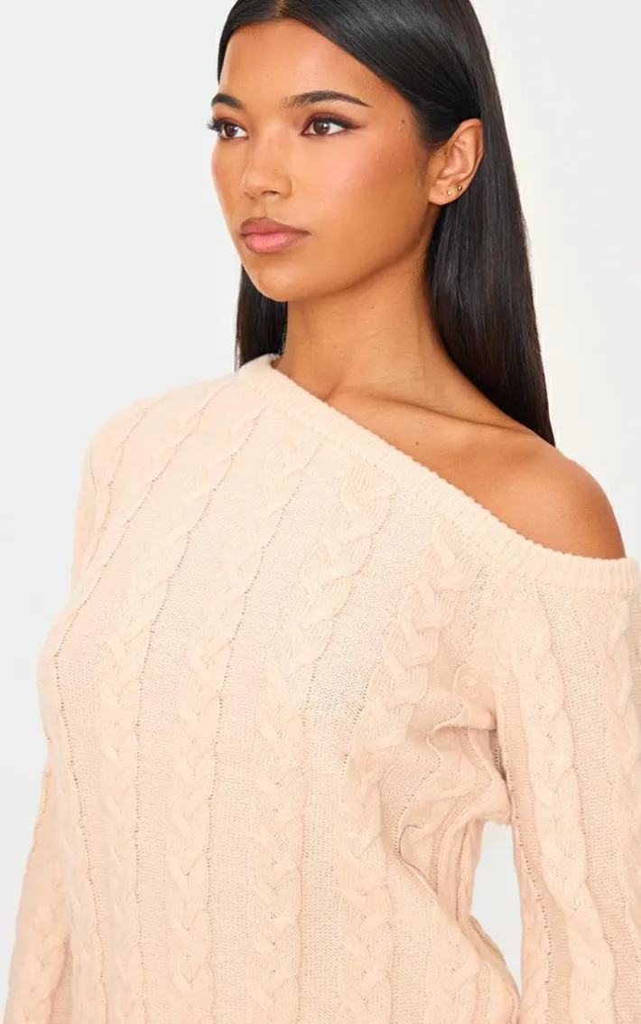 Bring all the cosy feels to your outfit of the day with this oatmeal cable knit asymmetric neckline oversized sweater. Made from an oatmeal cable knit material with an asymmetric neckline and an oversized fit, what’s not to love? Style this cable knit sweater with the matching skirt, heeled boots and simple gold accessories for an everyday look like no other.