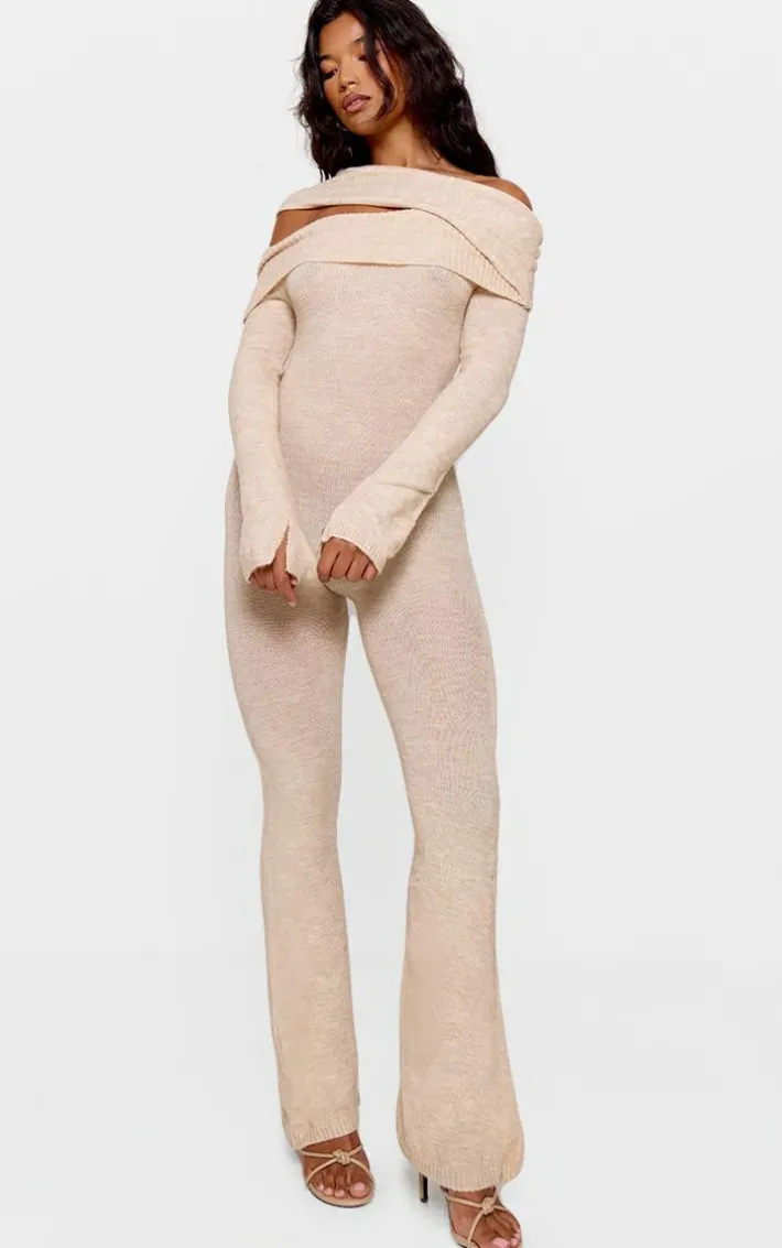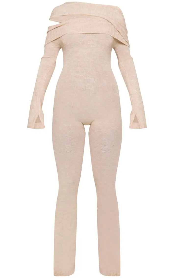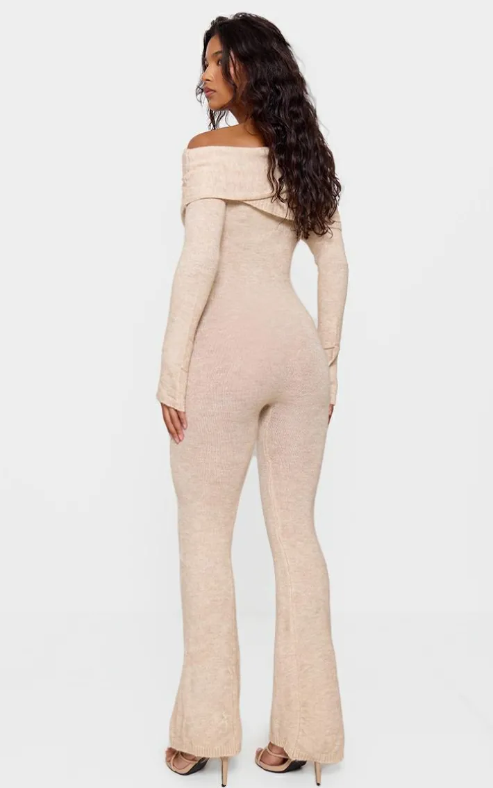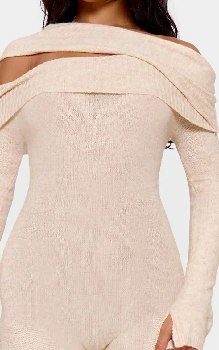 Step out in style with this oatmeal soft knit bardot foldover asymmetric neck jumpsuit. We’re obsessed with the oatmeal color soft knit material, and the bardot foldover asymmetric neck design will make you stand out in any crowd. How could you say no? Pair this with some comfy flats and a cream shoulder bag to finish off the look.