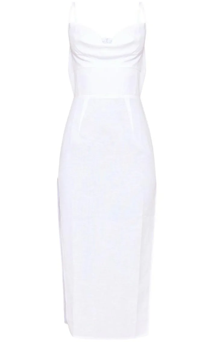 Add some chic vibes to your weekend wardrobe with this off white linen cowl neck binding detail midaxi dress. This dress is made from an off white material with a cowl neck design and a binding detail for a little added luxe. Style with your fave heels and a pair of gold hoops to finish off the look everyone is loving.