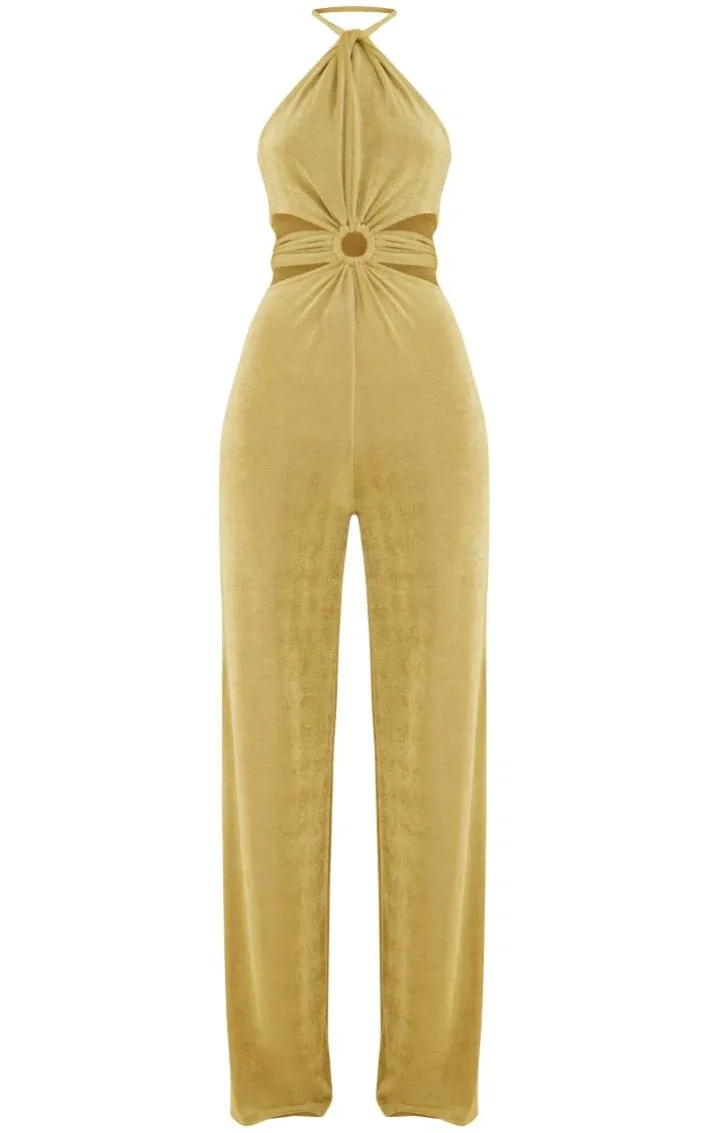 Get ready for the weekend with this olive acetate slinky ring detail cut out halter jumpsuit. Its olive acetate slinky material is so on trend right now and its ring detail adds all the luxe vibe to your look. This jumpsuit is the must-have that every ‘s wardrobe needs especially with its cut-out design and halter neckline. Simply add clear heels, gold accessories and a mini bag for a weekend-worthy finish.