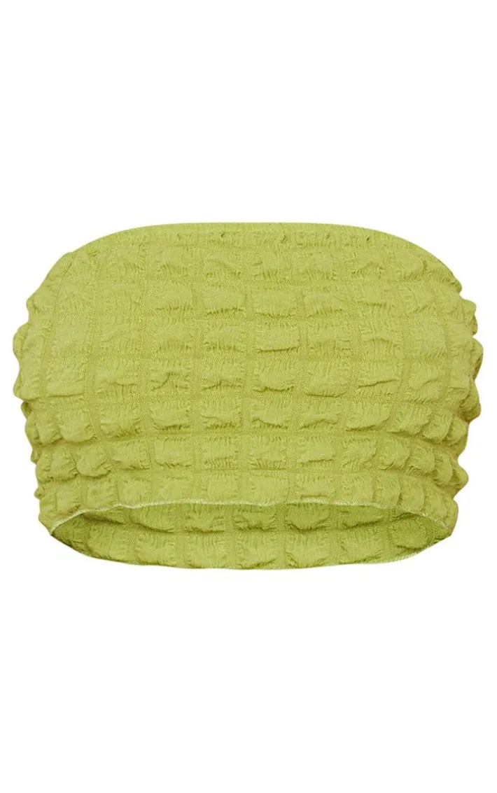 Inject some new hues to your look with this must-have crop top. Featuring an olive material with a bubble textured design and a bandeau neckline, we are in love. Style with the matching skirt and your fave accessories to make sure all eyes are on you.