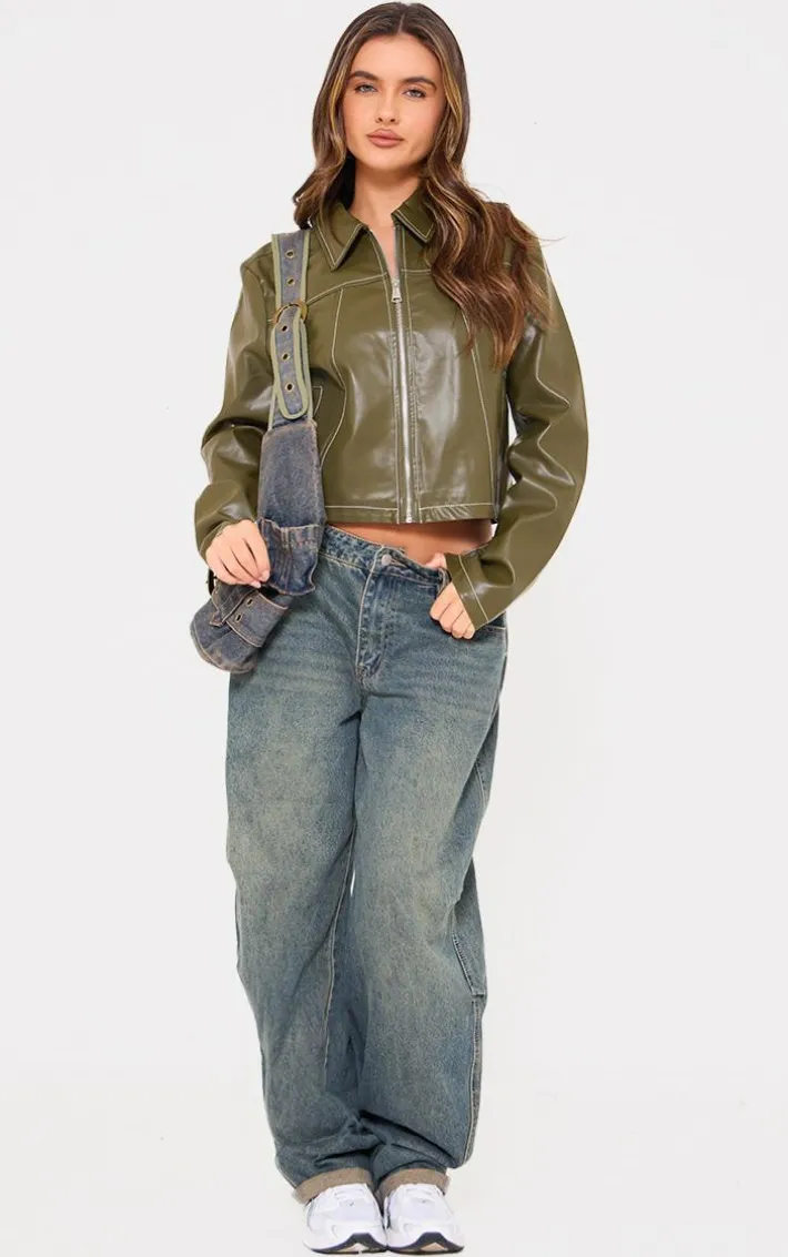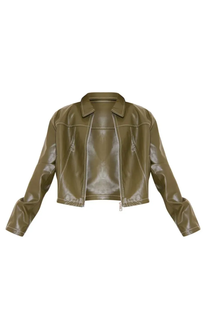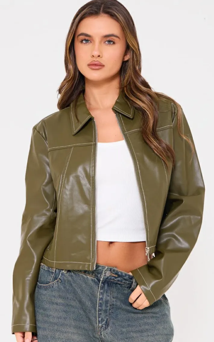 Meet your new season essential with this olive faux leather contrast stitch jacket. Brought to you in an olive hue faux leather material with a zip through fastening and a contrasting stitch, what more could you want? Style this olive jacket with a white top, jeans and sneakers for an effortless everyday look like no other.