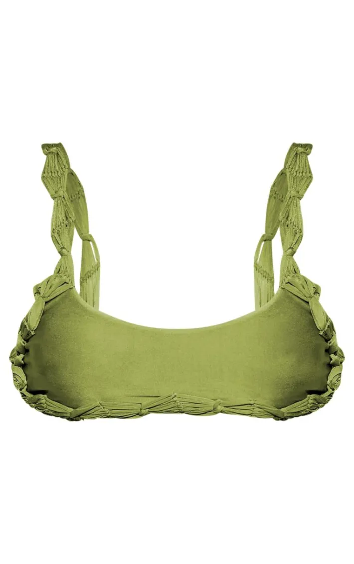 Get your glow on this season in this olive macrame detail bikini top. Brought to you in an olive material with a macrame detail, what’s not to love? This bikini top is calling your name. Style with the matching bikini bottoms, gold accessories and shades for a glam pool-side look.