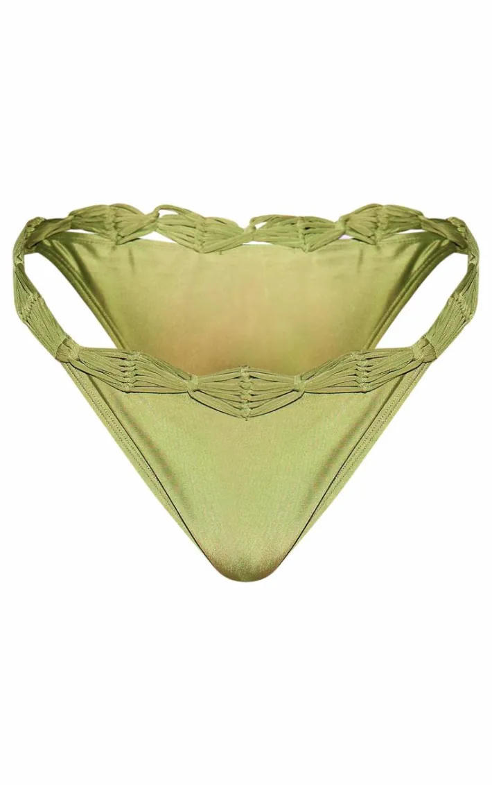 Add some dreamy hues into your vacay wardrobe with this olive macrame detail high leg bikini bottoms. These bikini bottoms are brought to you in an olive hue with a macrame detail and a high leg fit, what’s not to love? Complete the look by pairing this with the matching bikini top, sandals and accessories for a look that won’t let you down.