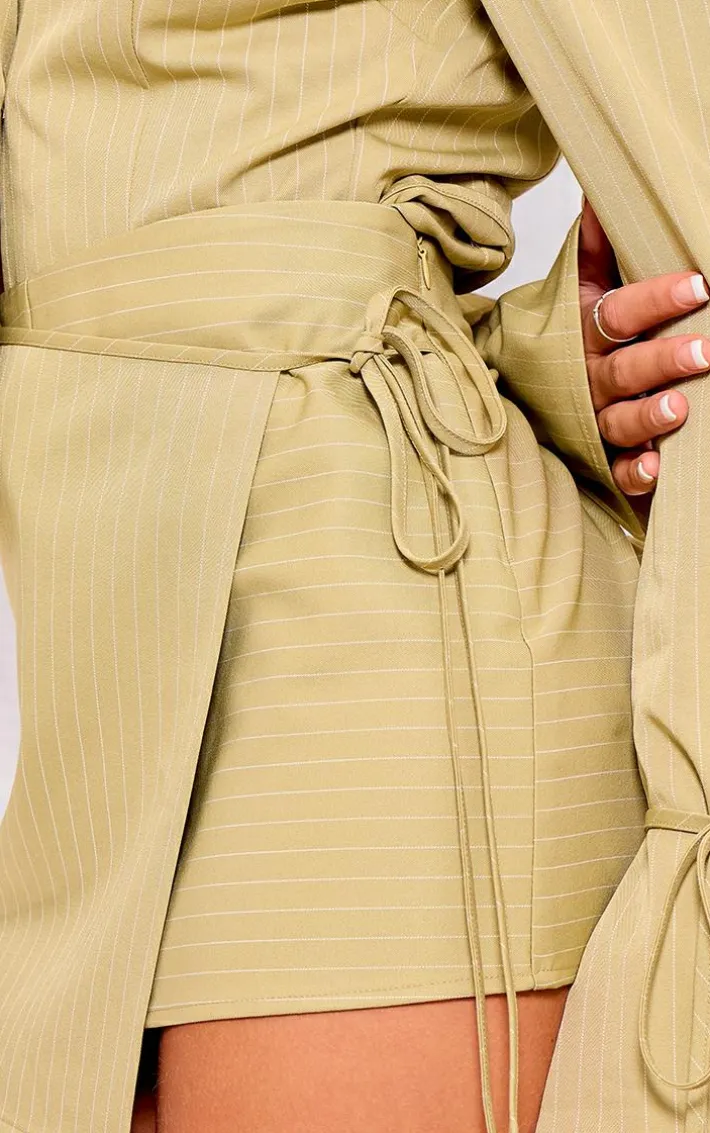 Dress to impress in this olive pinstripe woven tailored wrap over skirt Brought to you in an olive pinstripe woven material with a tailored fit and wrap over detail, this skirt is at the top of our wish list. We are seriously obsessed. Style with the matching pieces and white heels for a chic finish we can’t take our eyes off.