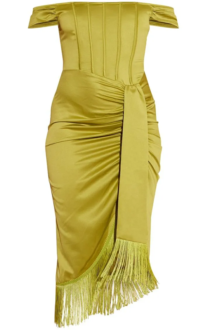 Add some luxe satin feels to your weekend wardrobe with this midi dress. Featuring an olive hue satin material with a bardot design, tassel detailing and a draped midi fit, we’re obsessed. Just add tie up heels and a matching mini bag to elevate the look.