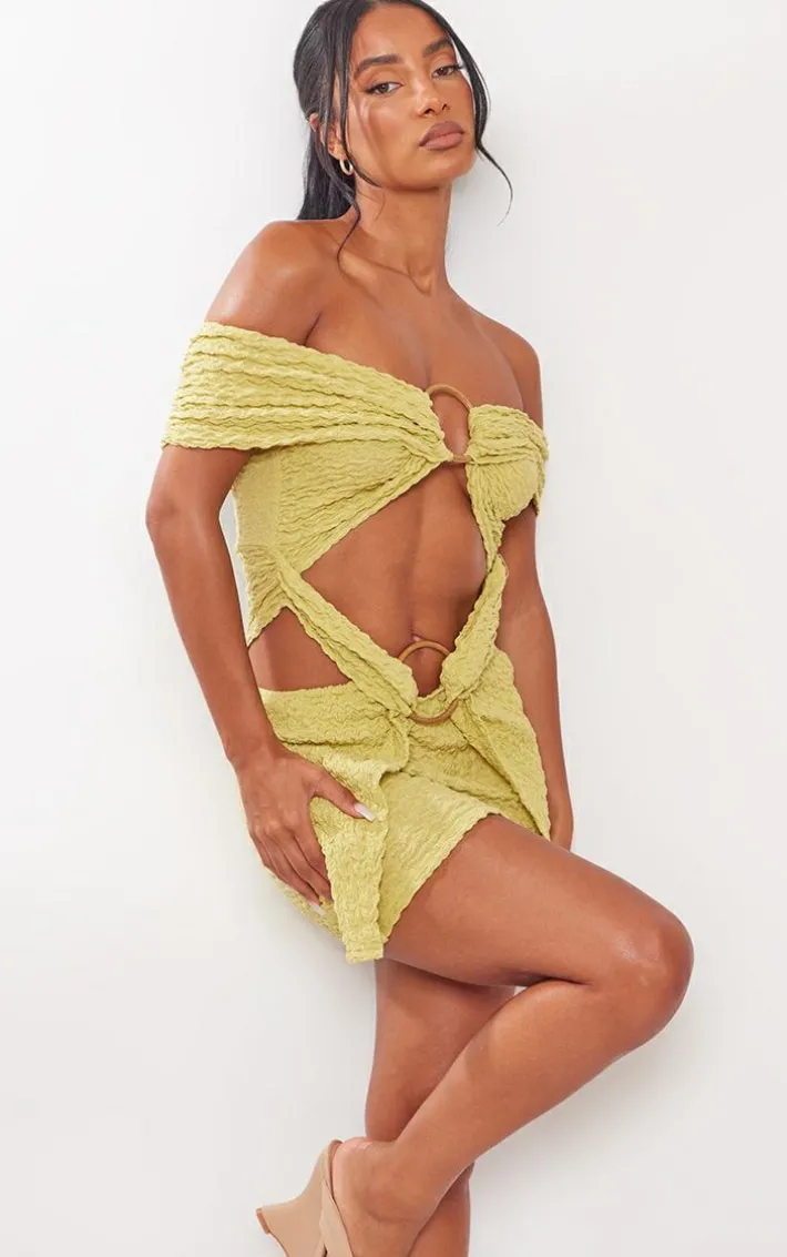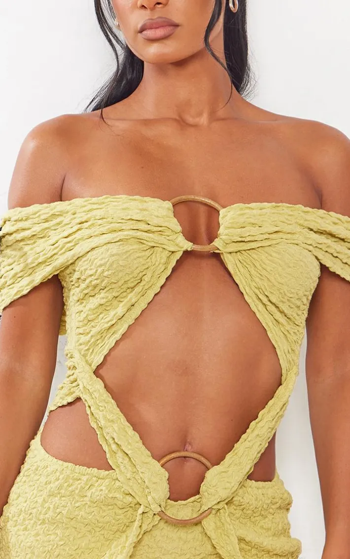 This olive textured ring detail bodycon dress will have hearts racing for all the right reasons. Brought to you in an olive textured material with a ring detail we are obsessing over. With a bodycon fit, you will be stealing all the stares at that next upcoming event. Team with some slip on heels and some small gold hoops to finish off the look.