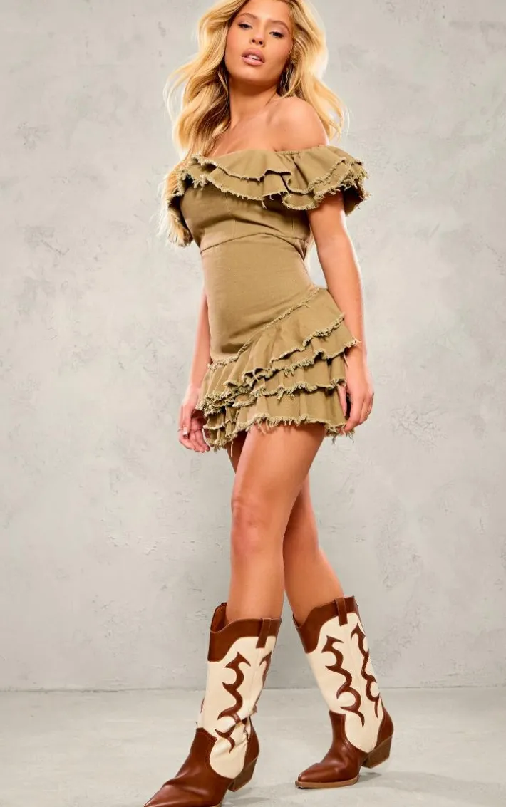 Found some last-minute weekend plans and need an unreal ‘fit? Then we have you covered with this styling staple, an olive bardot frayed edge tiered shift dress. With an olive twill material, a bardot design and a frayed edge, we’re obsessed. Work your styling techniques and add high heels with your gold accessories for a weekend-worthy finish that will gain all the likes.
