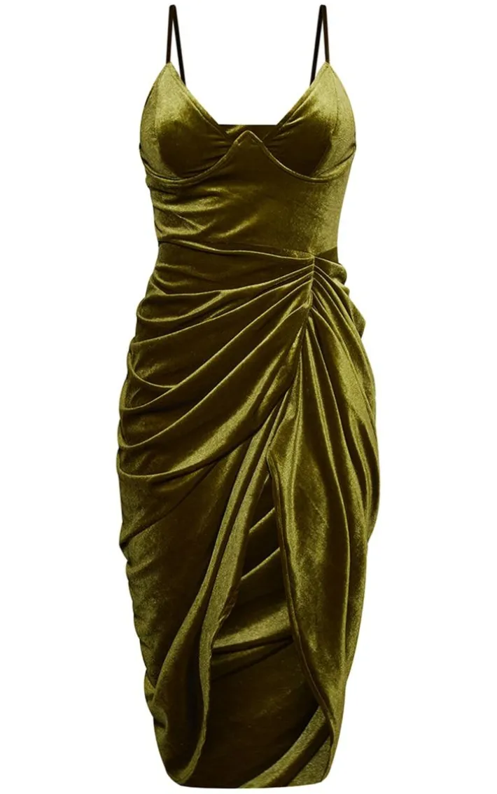 This dress is perfect for your next date night. Featuring an olive velvet material with an underwired design and draped style. Pair with clear heels and simple accessories for a glam finish.