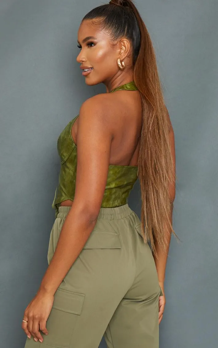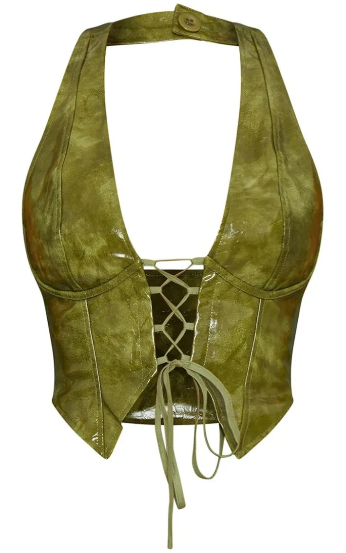 Got plans for the weekend ? Then this top is a must. Featuring an olive washed faux leather material with a lace-up front design and a halterneck fit. Pair this with matching hue bottoms and heels for a look we’re obsessing over.