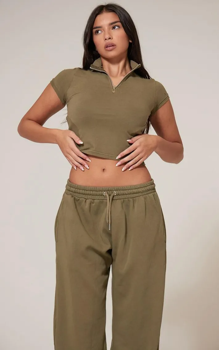 This olive washed zip up rib panel top is an autumnal staple. Whether you’re running errands or relaxing at home, its olive washed fabric, zip up detail and ribbed side panel design will keep you looking elevated. Match with the olive washed sweatpants, sneakers and your must-have accessories.