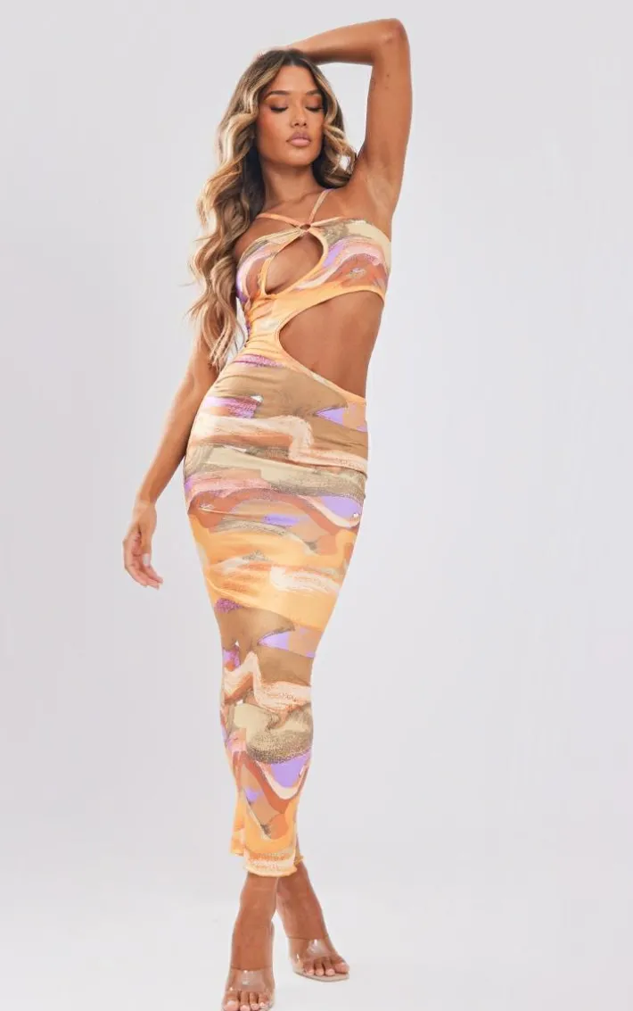 Get your glam on with this orange abstract print slink ring detail cut out maxi dress. This statement maxi dress is made from an orange abstract slinky print material with ring detailing and a cut-out design, you’re sure to have all eyes on you. When the weekend calls so does this women’s cut-out maxi dress. So what are you waiting for? Shop the look and opt for clear high heels and gold accessories for a look that we can’t stop crushing on.