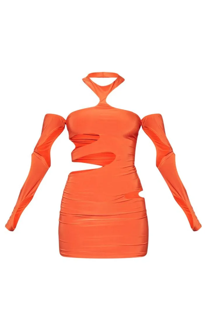 Dare to stand out from the crowd in this statement orange extreme cut out sleeve detail high neck bodycon dress, you won’t be able to resist. Brought to you in an orange material with an extreme cut out sleeve design and a high neck style, this bodycon dress will earn you all the compliments. Pair it with some knee high chunky boots and simple accessories for a fierce finish.