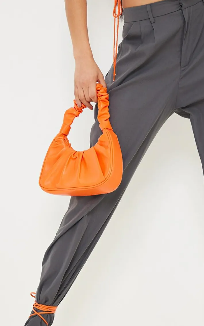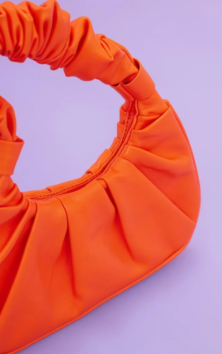 Add a pop of orange to any look with this insanely cute bag. Featuring a orange material with an extreme ruched handle detail, we’re obsessed