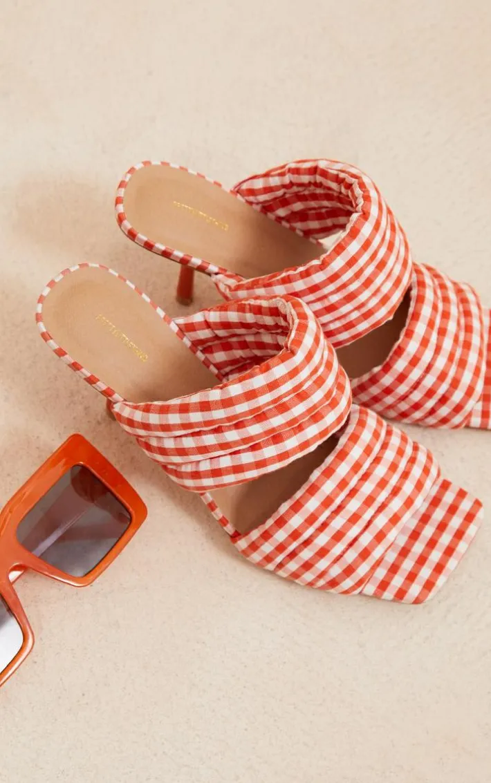 Take your look to a new level with these mules. Featuring an orange material with a contrasting gingham print, square toe design and padded straps, they’re perfect for any occasion.