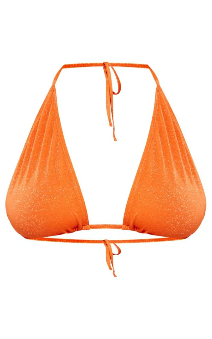 Turn heads for all the right reasons with this orange glitter fuller bust triangle bikini top. Its orange glitter fabric is sure to show off your glow and its triangle design is super flattering on your figure. This bikini top is made with our fuller bust ‘s in mind and we know you will be obsessed with this bikini top as much as we are. Simply pair with the matching bikini bottoms and gold accessories for a glam finish that will get everyone talking.