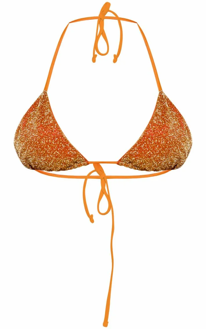 We are obsessed with this bikini top for your next vacay. Featuring an orange material with glitter detailing and a triangle design. Style with the matching bottoms and a floppy hat to elevate the look and steal all the poolside stares.