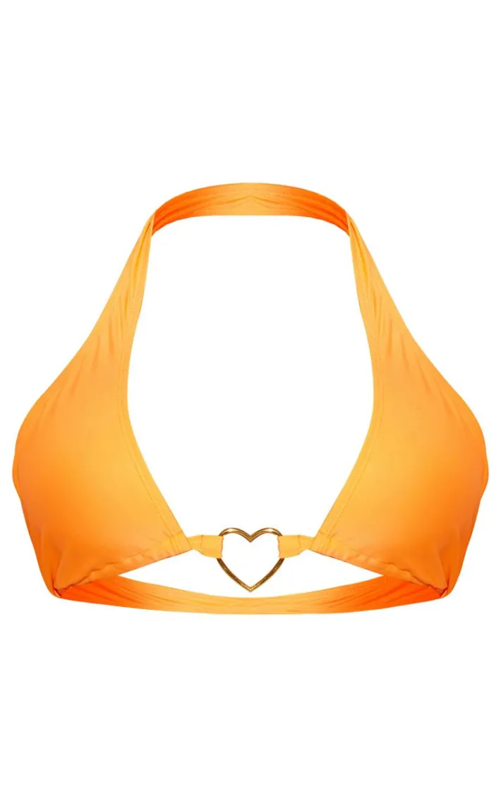 Soak up the sun in style in this orange heart trim halterneck bikini top. Brought to you in an orange hue material with a halterneck design and heart trim detailing for that extra touch of glam, we are obsessed. Style this bikini top with the matching bikini bottoms and just add gold accessories for a poolside look that won’t go unnoticed.