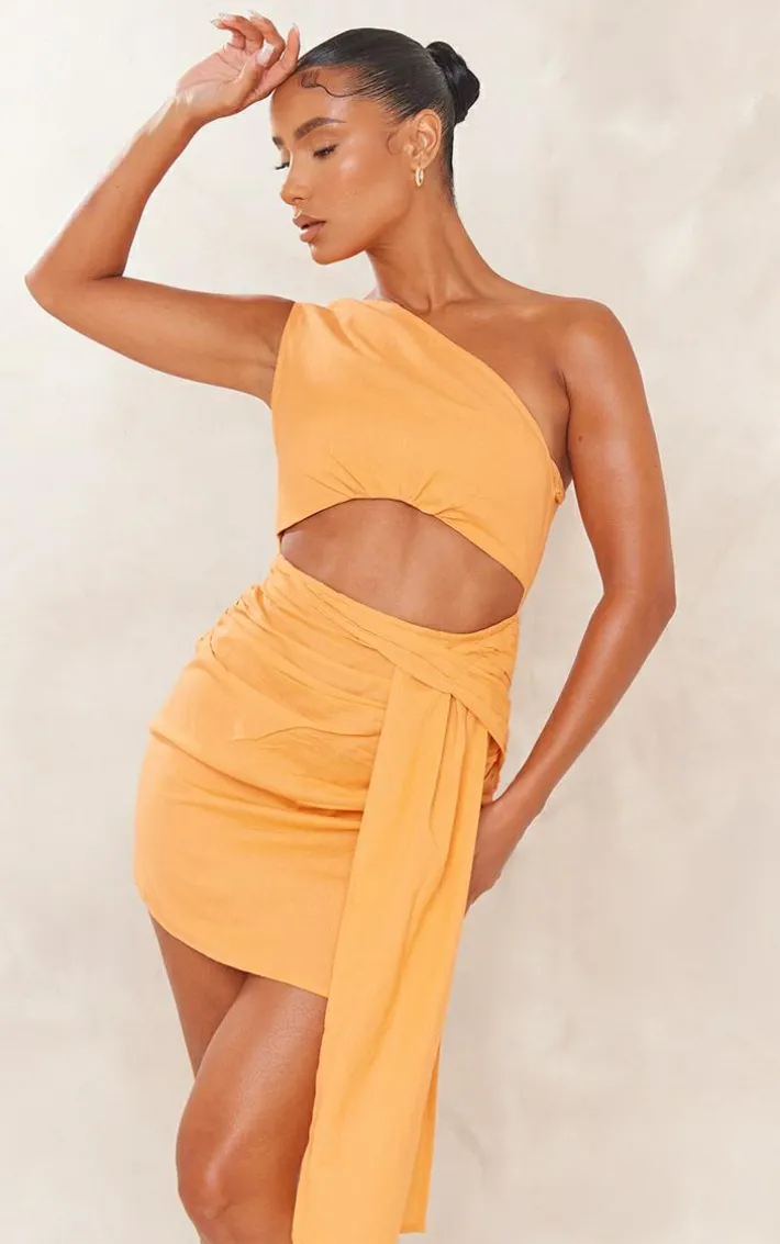 Get ready for those warm weather days with this orange linen look one shoulder cut out drape bodycon dress, it is everything we are loving for your weekend plans and beyond. This dress features an orange linen look material with a cut out design and a one shoulder style, how could you resist? Pair this bodycon dress with tie-up heels and your fave accessories for a look everyone will want.