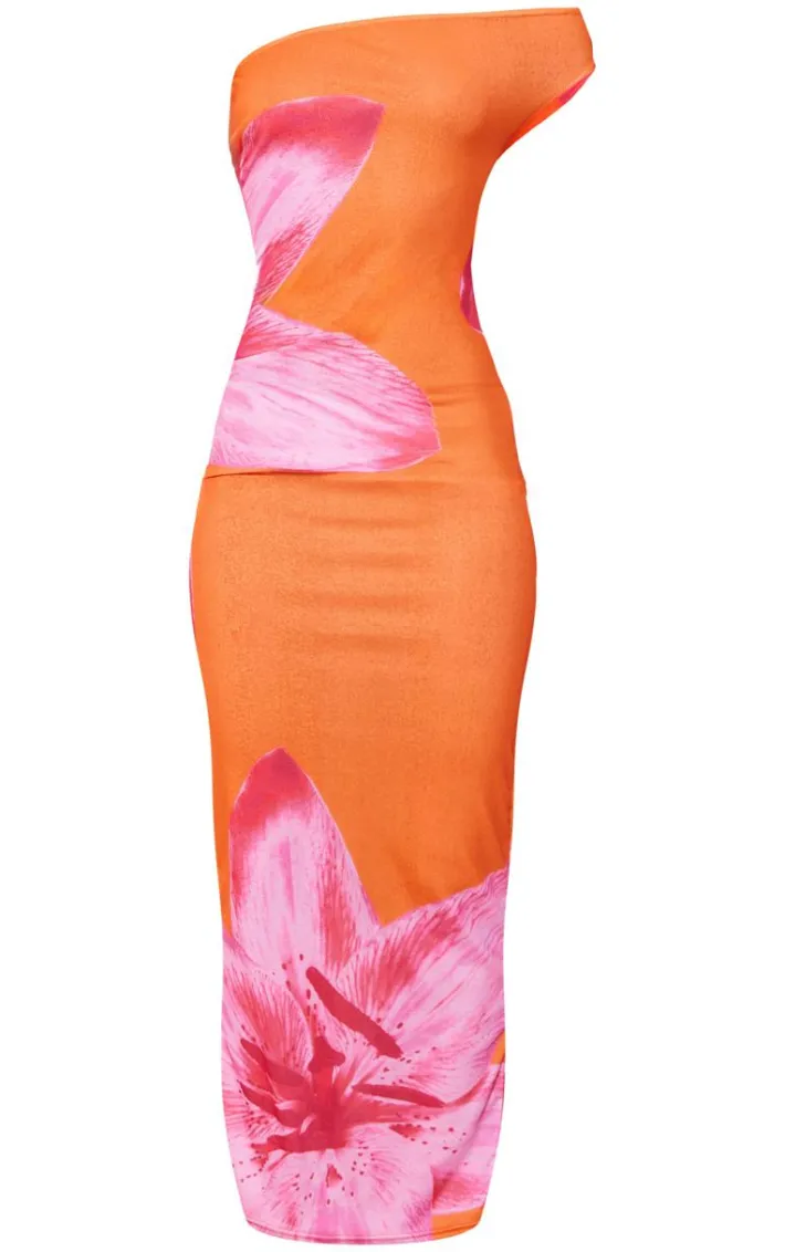 Steal all the stares in this orange onion skin one shoulder orchid plant maxi dress. Brought to you in an orange hue onion skin material with an orchid print design and one shoulder detail, this maxi dress is at the top of our wish list. Style with pink flats and gold accessories for a look like no other.Â