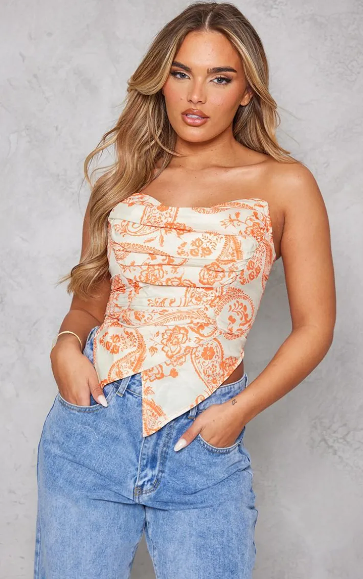 Inject some statement prints into your weekend wardrobe with this orange paisley print woven asymmetric pointed hem corset. Made from an orange hue woven material with a paisley print we just can’t get enough of and an asymmetric pointed hem design, what more could you ask for? In a flatteringcorset fit, this top is sure to take your weekend look from 0-100. Style with jeans, heels and gold accessories for a look that’s perfect for a date.