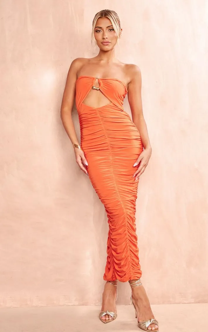 Turn up the heat on your weekend wardrobe with this orange slinky bandeau trim detail maxi dress, you’re sure to be earning all the likes. This dress features an orange slinky material with a trim detail and a maxi length. Pair this slinky dress with slip-on heels and your fave accessories for a dreamy date night look.
