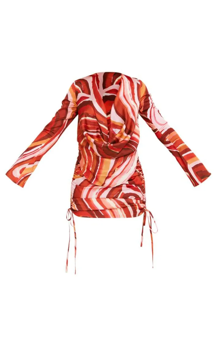 Get ready to stand out from the crowd in this orange swirl print satin extreme cowl ruched long sleeve bodycon dress. Brought to you in an orange hue satin material with a statement swirl print design, an extreme cowl neckline, ruched detailing, long sleeves and a flattering bodycon fit, how can you resist? Style this long sleeve dress with tie up heels and statement accessories to bring the look together.