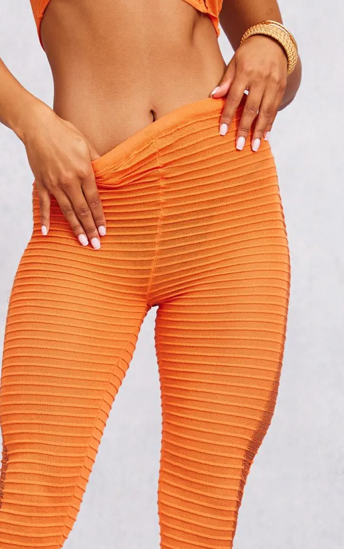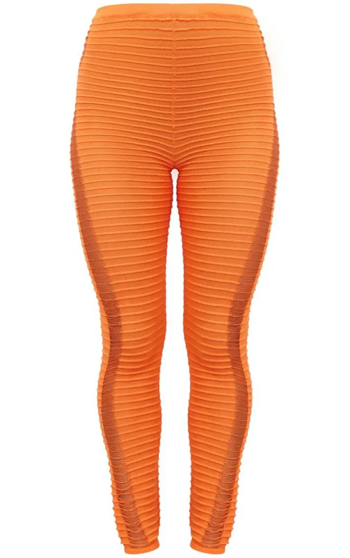 Be sure to stand out from the crowd in these orange textured sheer knit laddering leggings. Brought to you in a bold hue orange textured sheer knit material with laddering detail and a figure-flattering fit, what more could you ask for? We are loving these sheer leggings styled with the matching top, strappy heels and statement accessories for a weekend-worthy look to be remembered.