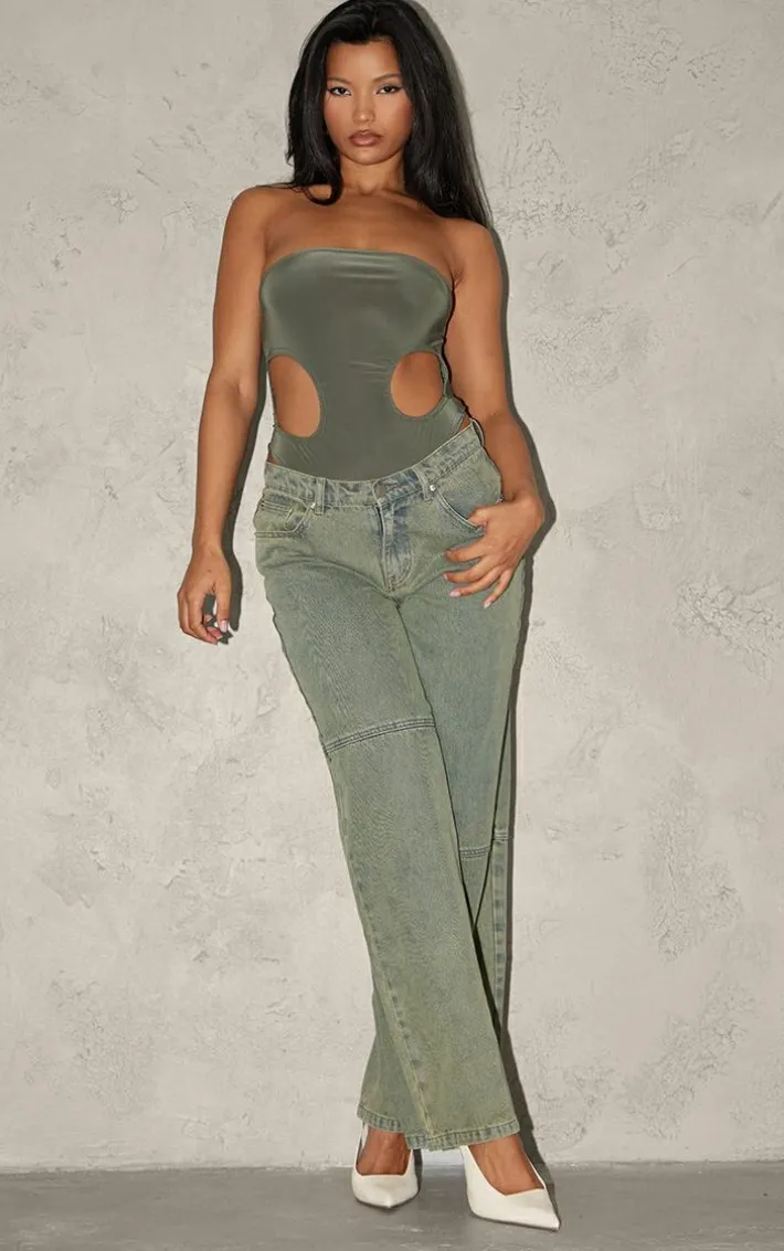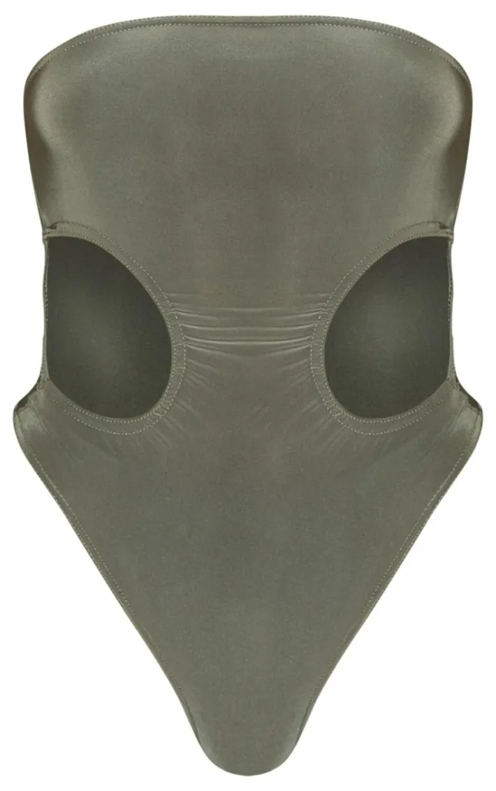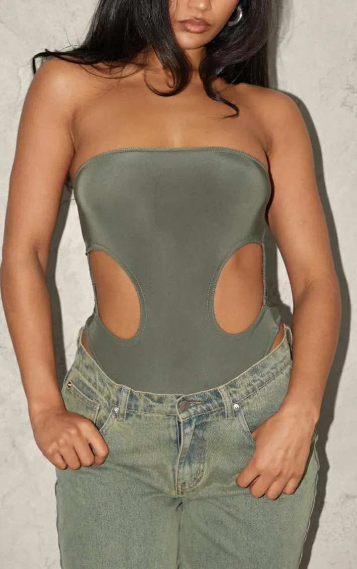 Turn heads in this pale khaki bandeau slinky cut out bodysuit. Brought to you in a pale khaki slinky material with a bandeau design, what’s not to love? Its cut out detail gives you a flattering fit like no other. Team with a pair of your go-to jeans and accessories for a look like no other.