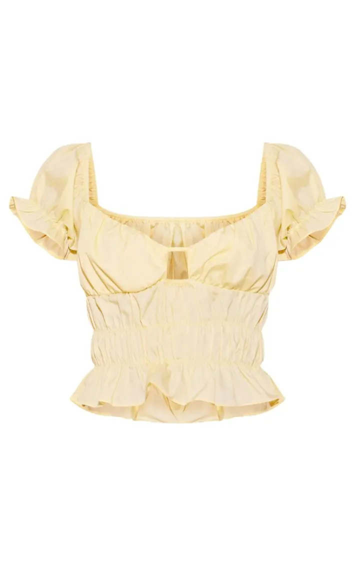 Look all kinds of glam in this pale yellow shirred ruched crop top. Brought to you in a pale yellow hue shirred material with a ruched detail, this crop top is a must have. Style with a puffball skirt, nude sandals and gold accessories for a look like no other. It’s a yes from us.