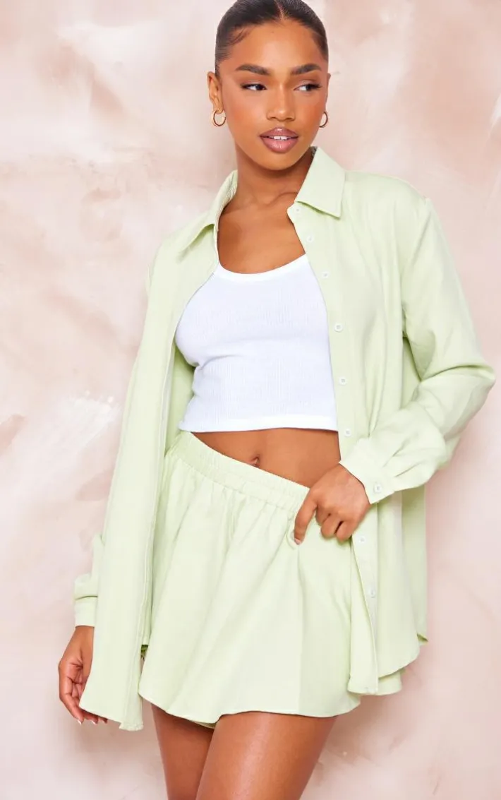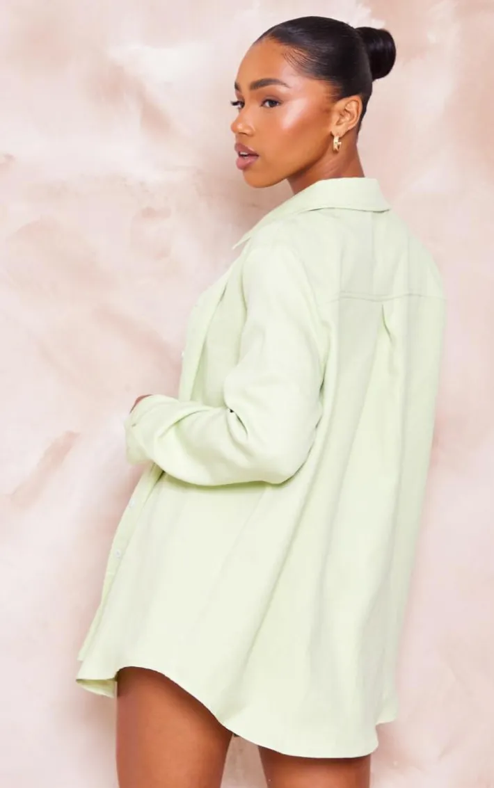 Add some dreamy pastel hues to your new season wardrobe with this pastel green long sleeve oversized shirt. Brought to you in a pastel green hue material with long sleeves, a button down front and an oversized fit, this shirt is sure to brighten up any look. We are loving this styled with the matching shorts, a white tee, flatform sandals and gold accessories for an effortlessly off-duty ‘fit that is sure to make you stand out from the rest.