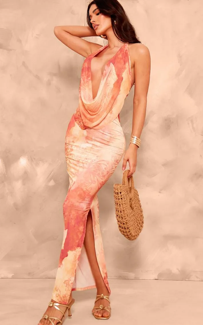 Get ready to have all eyes on you with this peach blurred mesh extreme cowl neck maxi dress. Brought to you in a peach mesh blurred material with an extreme cowl neck and a maxi length, what’snot to love? you’ll sure to earn all the likes with this dreamy piece. Finish off the look by pairing this with high heels and gold accessories. It’s a yes from us.