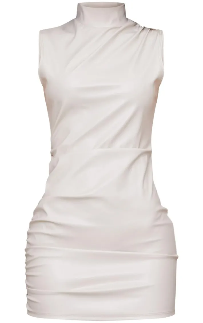 Say hello to your new season staple with this pebble faux leather high neck sleeveless ruched mini dress. Brought to you in a pebble faux leather material with a high neck design and a sleeveless fit, we are obsessed. Its ruched design and mini length will have all eyes on you. Team with knee length heeled boots and gold accessories to finish off the look.