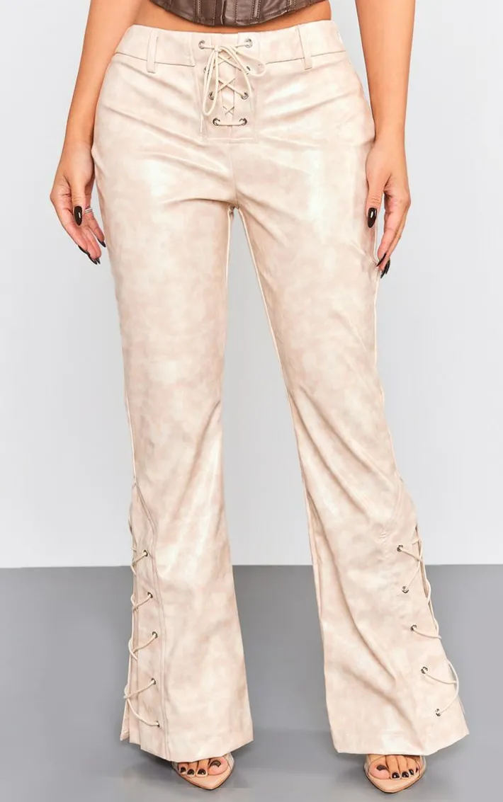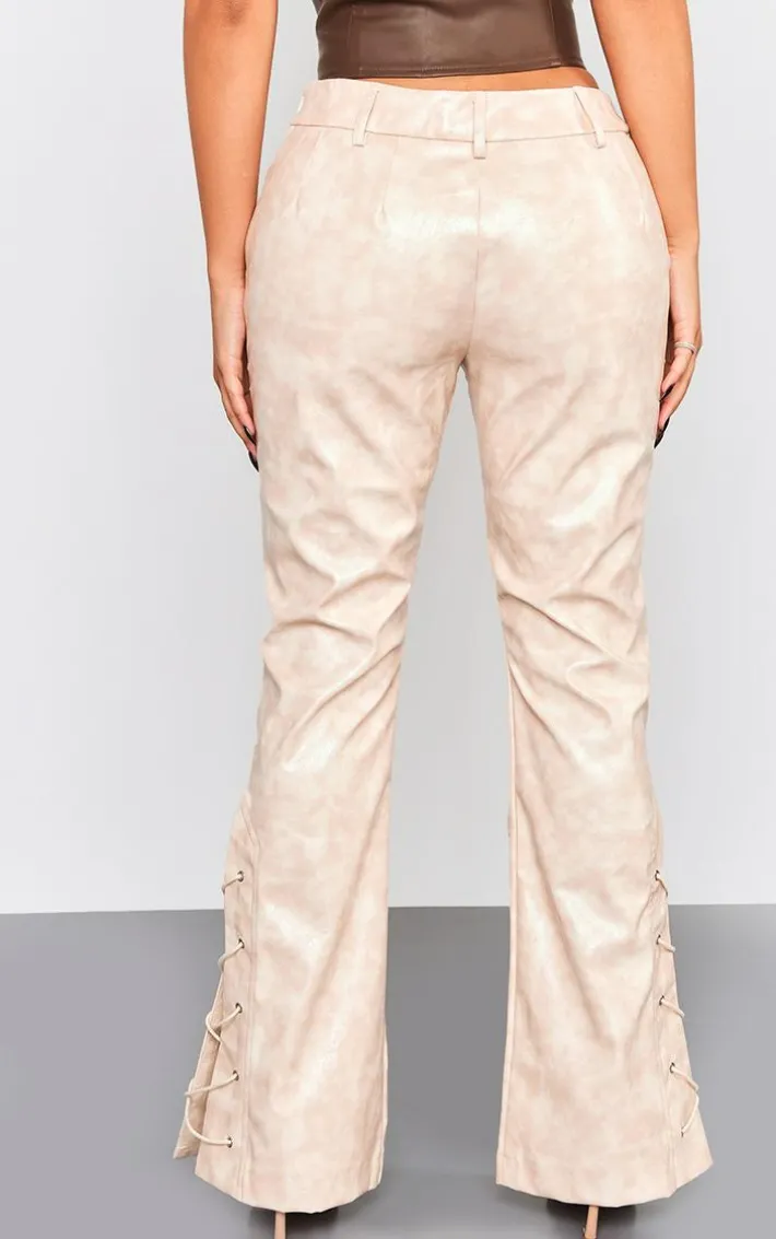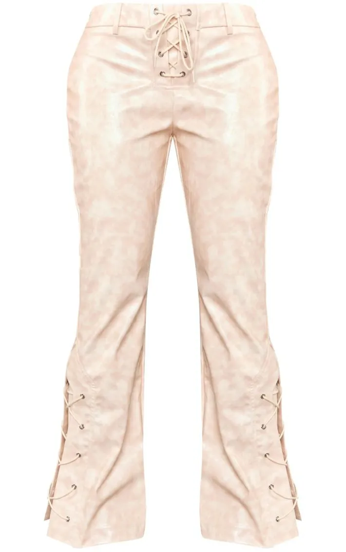 Bring all the fierce vibes to your new season wardrobe with these petite beige faux leather lace up straight leg pants, your weekend fit is finally sorted. With a beige faux leather material, a lace-up design and a straight leg fit, you’ll be adding these petite pants straight to your basket. Style with a corset top, clear heels and a shoulder bag for a flawless finish.