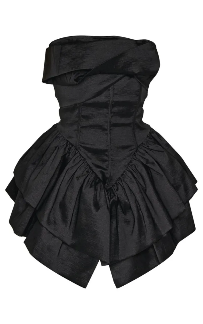 When the weekend calls so does this petite black bandeau corset detail ruffle hem mini dress. Brought to you in a black hue material with a bandeau neckline, corset detail and ruffle hem design, this mini dress is all the new you need. Style with tights, slip on heels and simple accessories for a look like no other.