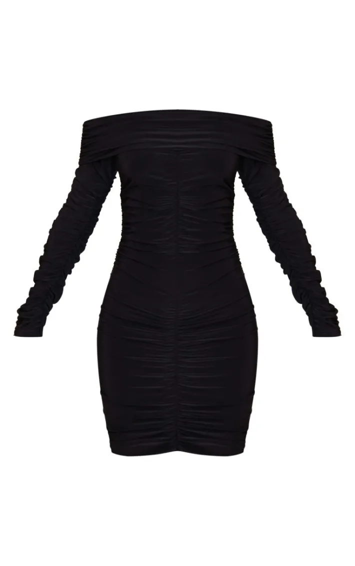 Take the stress out of weekend styling with this petite black double slinky bardot ruched mini dress. Brought to you in a black hue double slinky material with an bardot design and ruched detail, this mini dress is all the new you need. How can you resist? Style with knee high heeled boots and simple accessories for a look like no other.