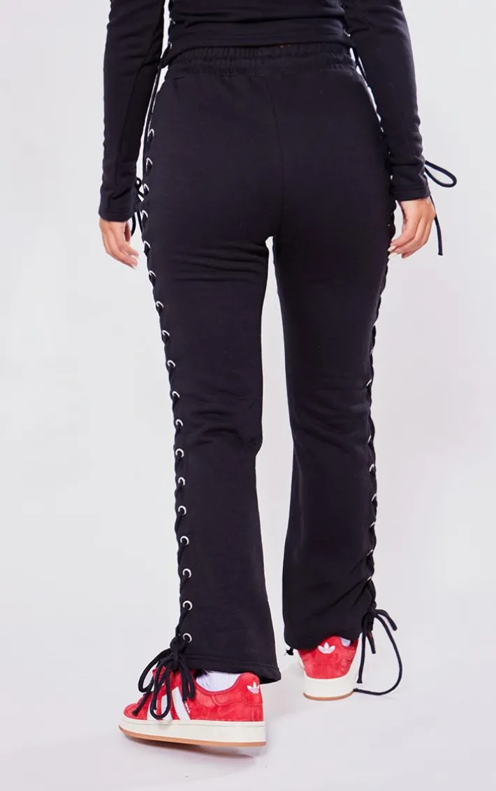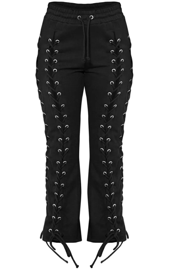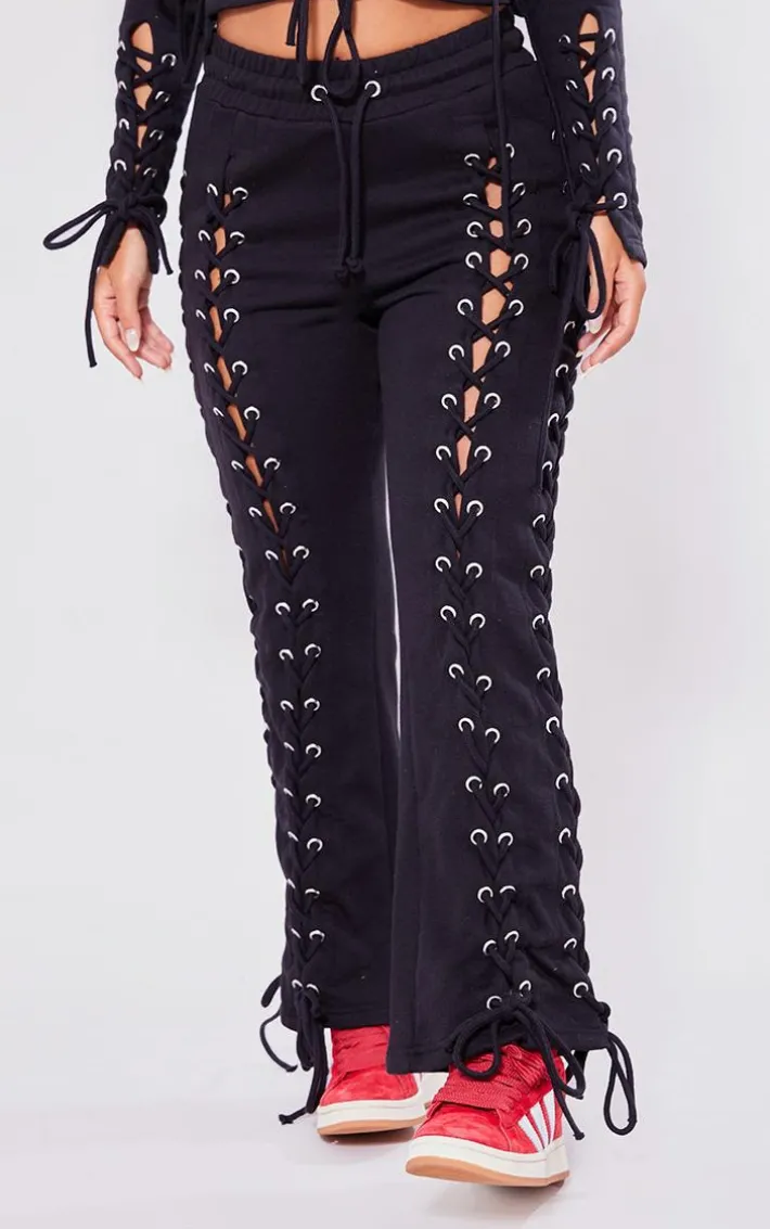 Take your everyday look to the next level with these petite black eyelet detail lace up sweatpants perfect for your everyday styling and beyond. Brought to you in a black eyelet material with lace-up detail, we simply can’tget enough. With It’s versatile style these sweatpants are sure to be your new go-to. Style with the matching top, box-fresh kicks and accessories for a look that we can’tget enough of.