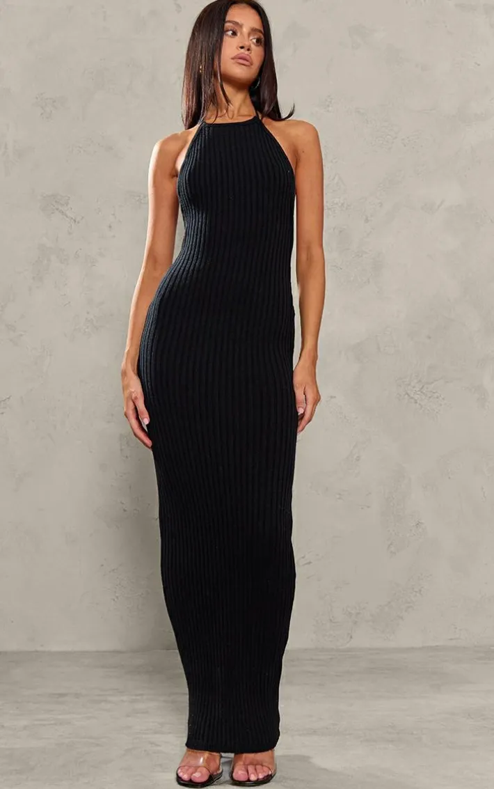 This petite black knitted open back maxi dress will give you the new season glow up that we’re all after. Brought to you in a staple black shade, with a knitted material for ultimate comfort and an open back design for a luxe finish. Style with your fave black heels and hoop earrings for a polished look.