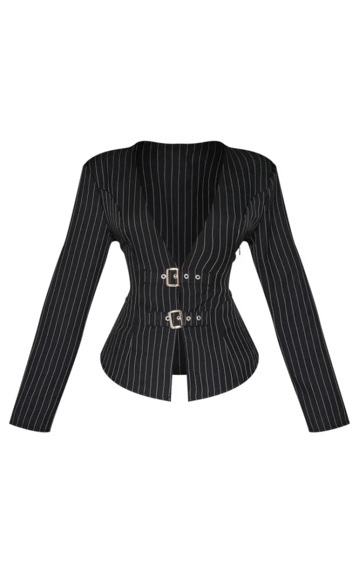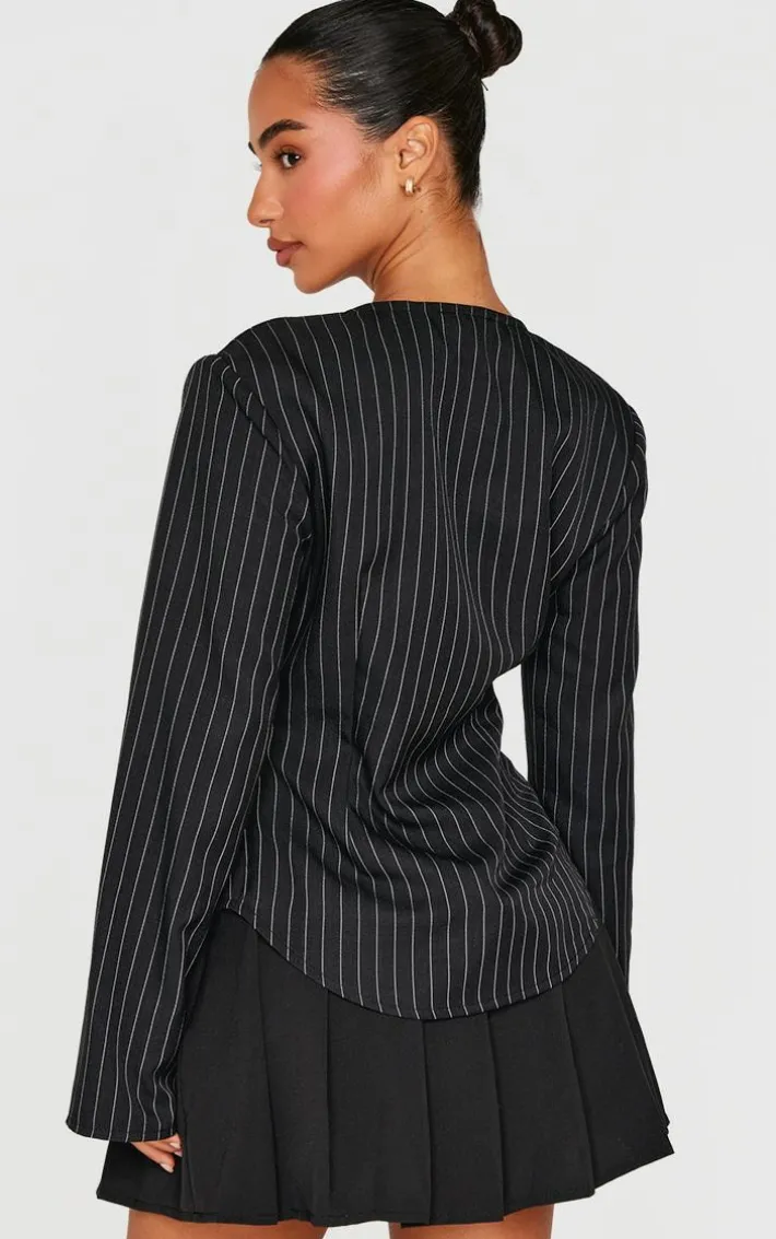 Your wardrobe is calling for this petite black pinstripe long sleeve trim detail shirt. Brought to you in a chic black tone, with a pinstripe design and trim detail, what’s not to love? This top pairs perfectly with a black mini skirt and knee high faux leather boots for a finish that can’t be beaten