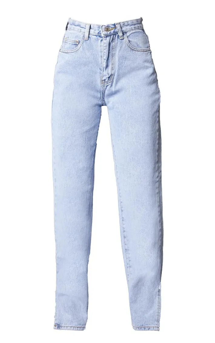 Amp up your weekend wardrobe with these jeans. Featuring a bleach wash material with a split hem. Team with a bandeau crop top and strappy heels for a look we are obsessing over.