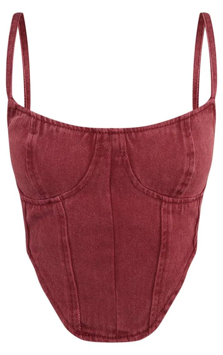 Make heads turn for all the right reasons in this petite burgundy dipped hem denim corset top. Made from a burgundy denim material with a dipped hem, a bandeau neckline and flattering corset fit, how can you resist? Style this corset top with the matching jeans, heels and gold accessories for a weekend-worthy look to be remembered.
